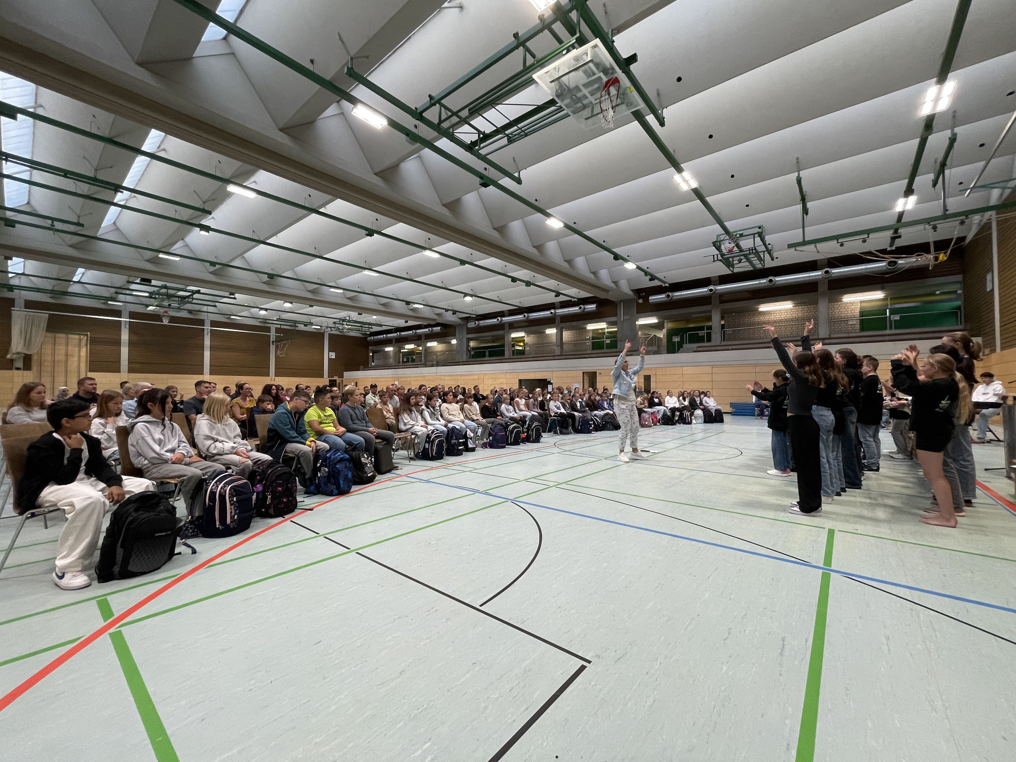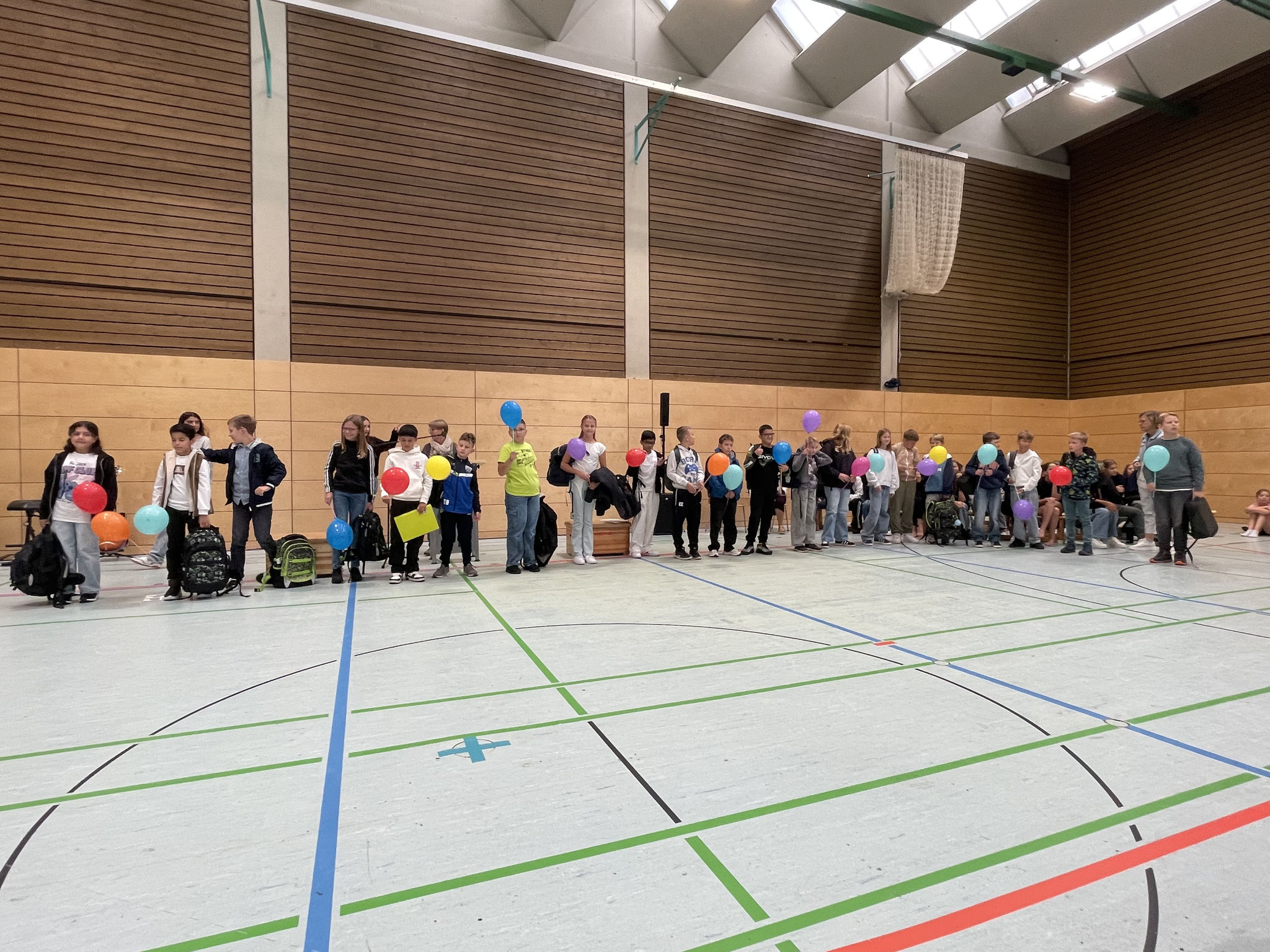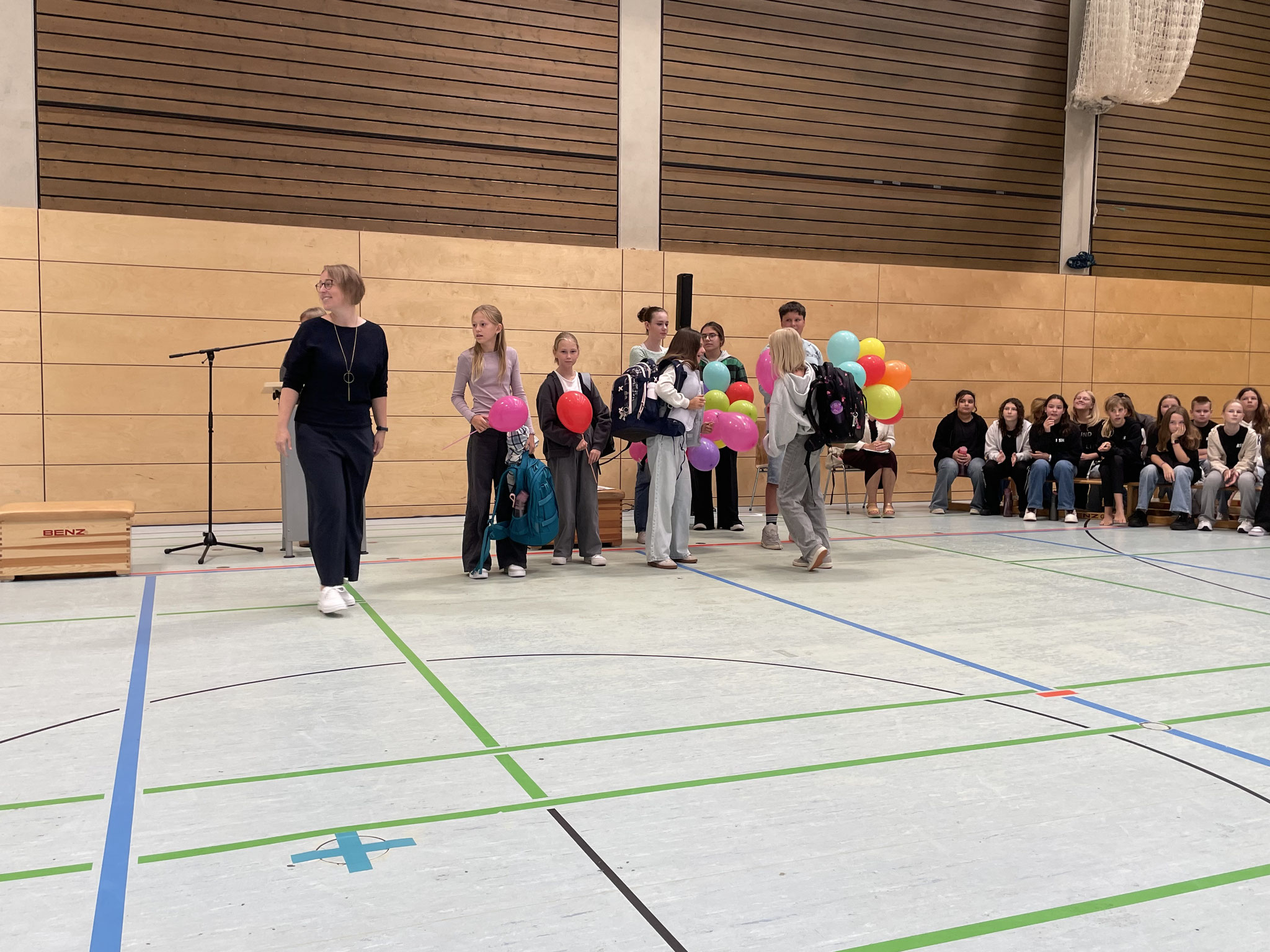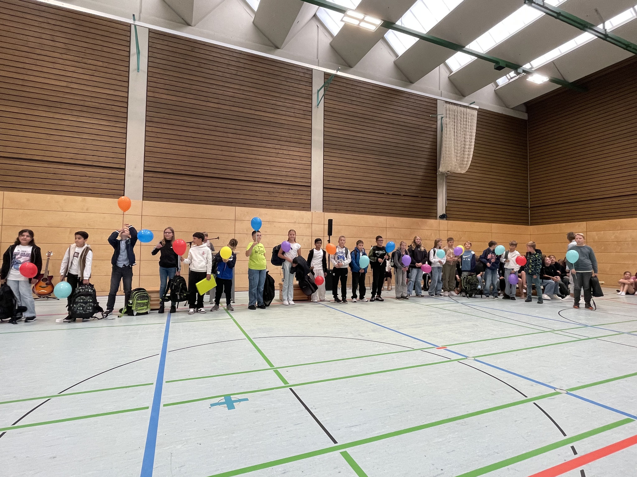 Am Dienstag, 16. September, konnten wir 47 neue Fünftklässler in unsere Schulgemeinschaft aufnehmen. Nach einer kurzweiligen, fröhlichen Aufnahmefeier in der Sporthalle mit Schulband und Schulchor ging es gleich mit den Klassenlehrerinnen und den Klassenpaten in die mit Spannung erwarteten neuen Klassenzimmer. Vielfältige Aktionen zum Kennenlernen und Eingewöhnen sorgten in der ersten Schulwoche dafür, dass die neuen Schülerinnen und Schüler sich zügig und angstfrei angekommen fühlen konnten.