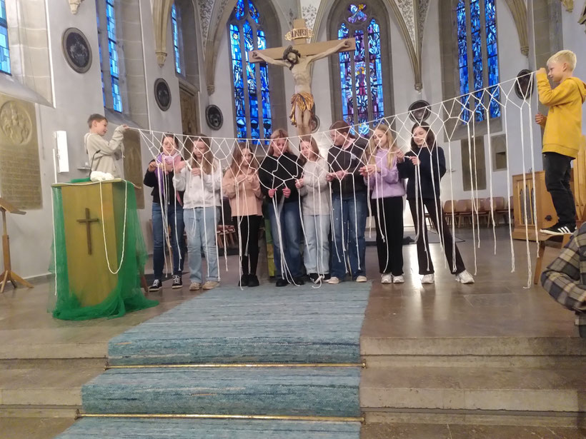 Mit dem Thema „Im Netz verbunden“ traf sich die RSH zum Gottesdienst in der St. Ulrichskirche in Heubach. Die Schulgemeinschaft mit ihren vielen Klassen wurde als soziales Netz von verschiedenen Seiten durch Gebete, Gedanken und Lieder beleuchtet. Das Netz, das uns auffängt und tragen kann – das Netz, das uns untereinander und mit Gott verbindet, wurde dabei auch von der Klasse 6a sinnbildlich geknüpft.
